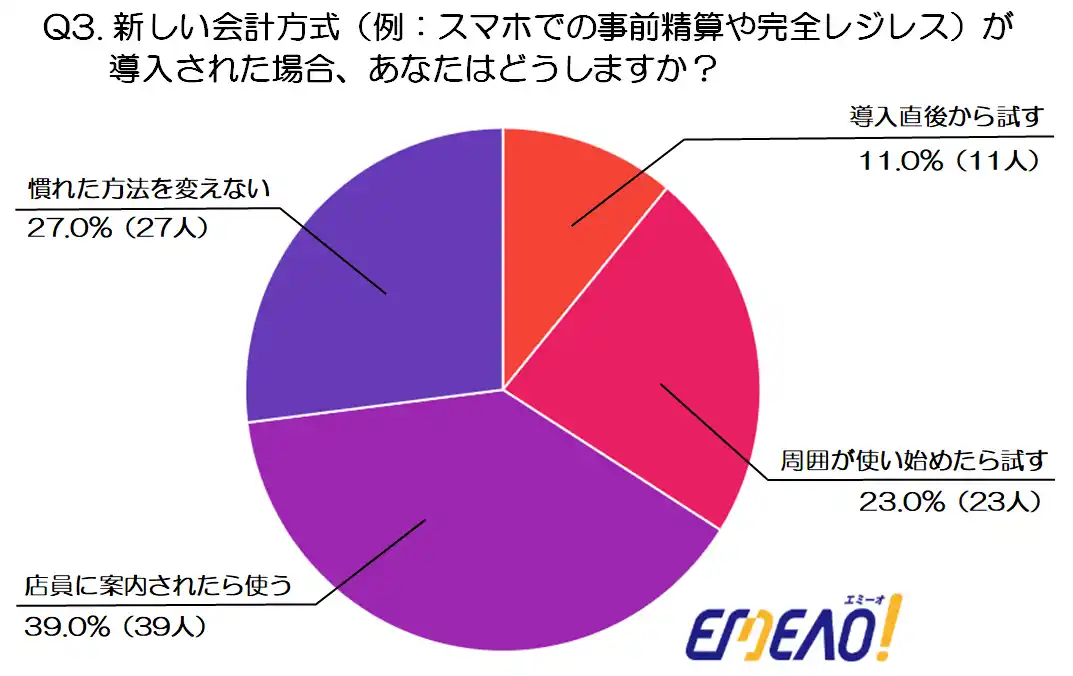 調査結果3:新しい会計方式(例:スマホでの事前精算や完全レジレス)が導入された場合、あなたはどうしますか? |