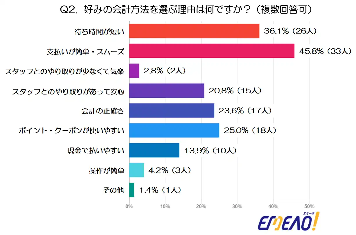 最も多かったのは「支払いが簡単・スムーズ」で、45.8%(33人)を占めました。この結果から、消費者は支払いの手軽さを重視していることがわかります。特に、迅速でスムーズな支払い方法が選ばれる傾向が強いことが伺えます。 |