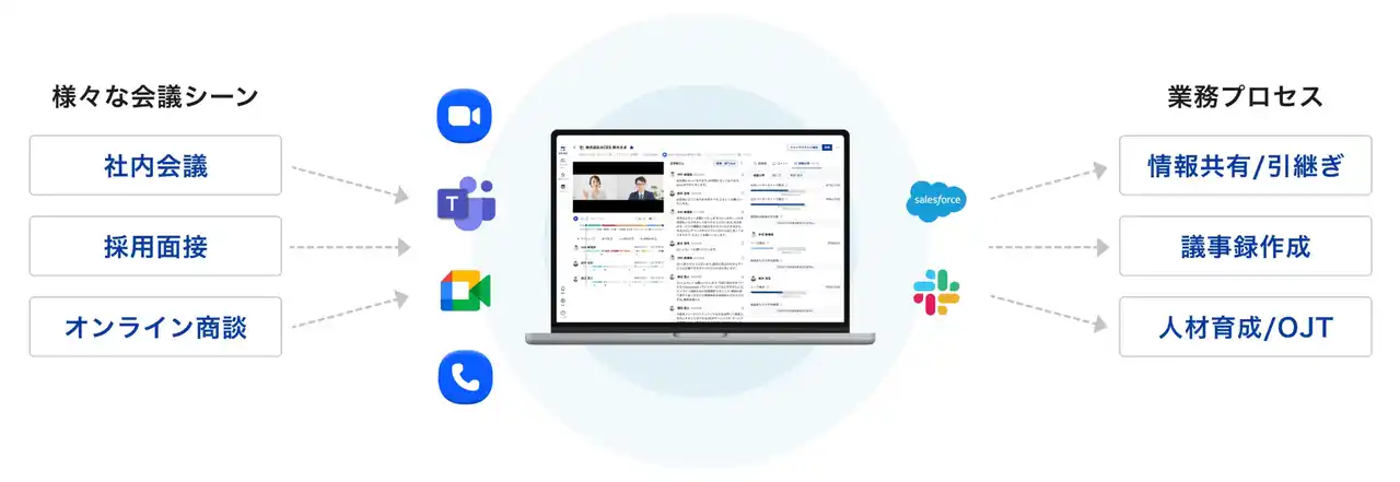 これまで「ACES Meet」では、SalesforceやHubSpotといった主要CRM、ならびにSlackなど外部サービスとの連携を実現し、多くのお客様にご活用いただいております。 |