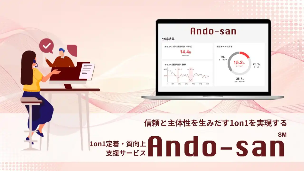 | Ando-san(あんどうさん)は、信頼と主体性を生みだす1on1を実現する1on1支援サービスです。科学的知見とデータサイエンスの技術から、1on1の定着・質の向上を促し、アイデアあふれるイノベーティブな組織の実現を支援します。 | ||||||||||||||