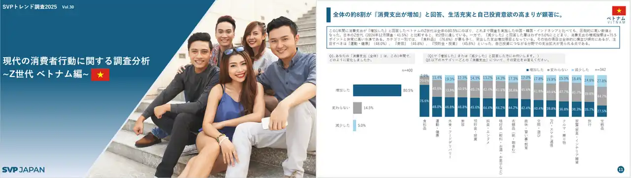 | 会員制マーケットリサーチサービスを提供している、株式会社SVPジャパン(本社:東京都中央区、代表取締役社長:橋本雅、以下「SVPジャパン」)は、『現代の消費者行動に関する調査分析~Z世代アジア4カ国編~』と題し、経済成長やデジタル化の進展が著しいアジア4カ国(中国、韓国、インドネシア、ベトナム)のZ世代を対象に、消費行動の調査・分析を実施する。今回は、ベトナムのZ世代を対象とした調査結果をレポートにまとめた。 | |||||
