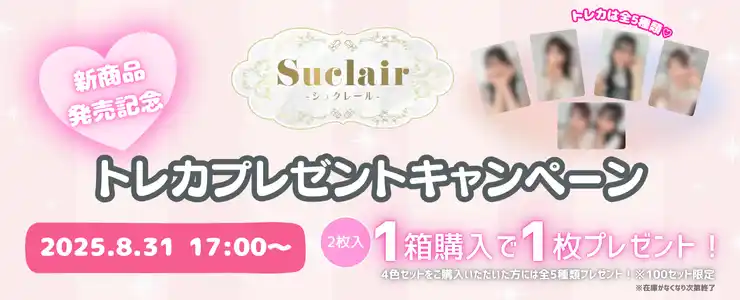 | 新商品発売を記念して、Suclairオリジナルトレカがもらえるキャンペーンを実施いたします。 | |||||||||||||