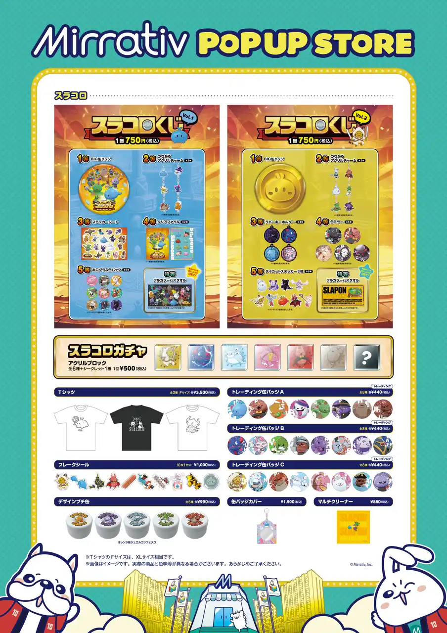 10周年のポップアップストアでは、ここでしか手に入らない新商品が多数登場! 前回の博多開催で好評だった「スラコロくじ」のvol.2が新たに登場するほか、ライブゲーム『スラポンコロシアム』のキャラクターを使ったパネルガチャも初お披露目となります。 |