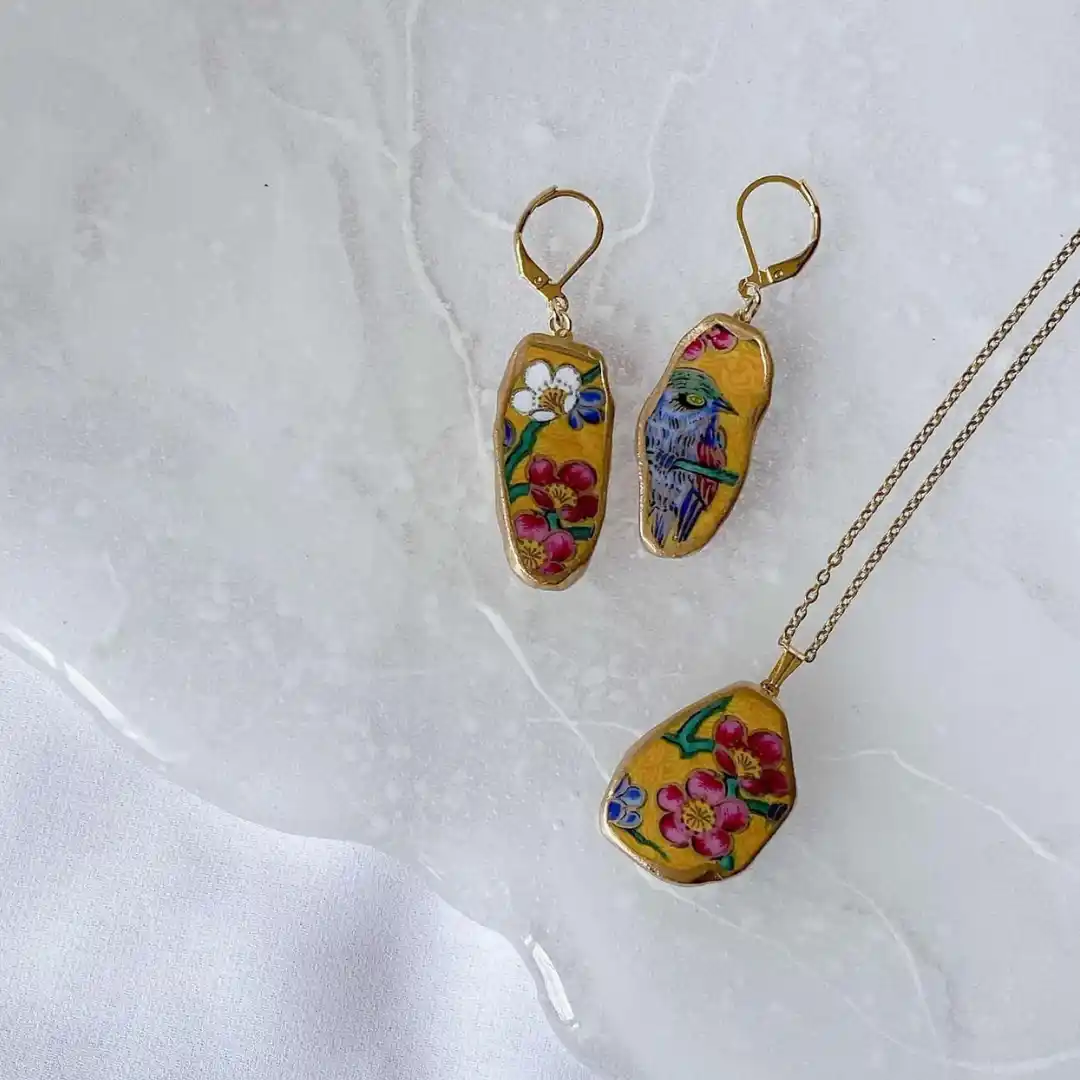 陶器や磁器、また天然石を金継ぎと掛け合わせた一点もの。写真は九谷焼を素材にネックレスとピアスを製作しました。 |