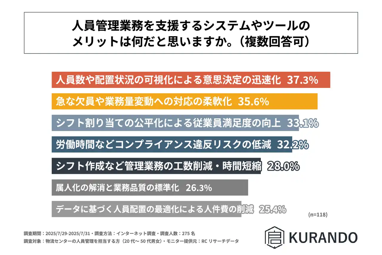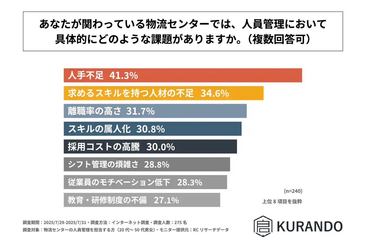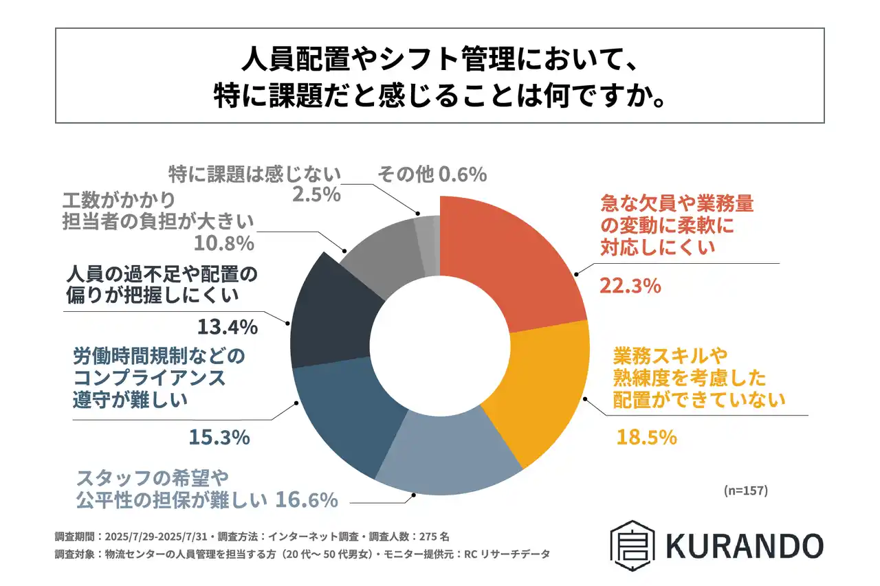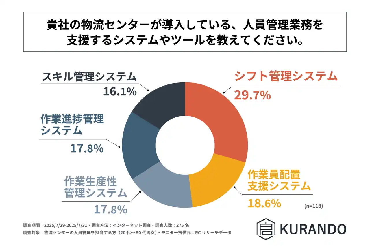 株式会社KURANDO(本社:東京都品川区、代表取締役:岡澤 一弘)は、物流センターで人員管理を担当する方を対象に「物流センターの人員管理」に関する調査を実施しました。この調査から、物流センターにおける人員管理の課題や人員配置・シフト管理の方法などが明らかになりました。