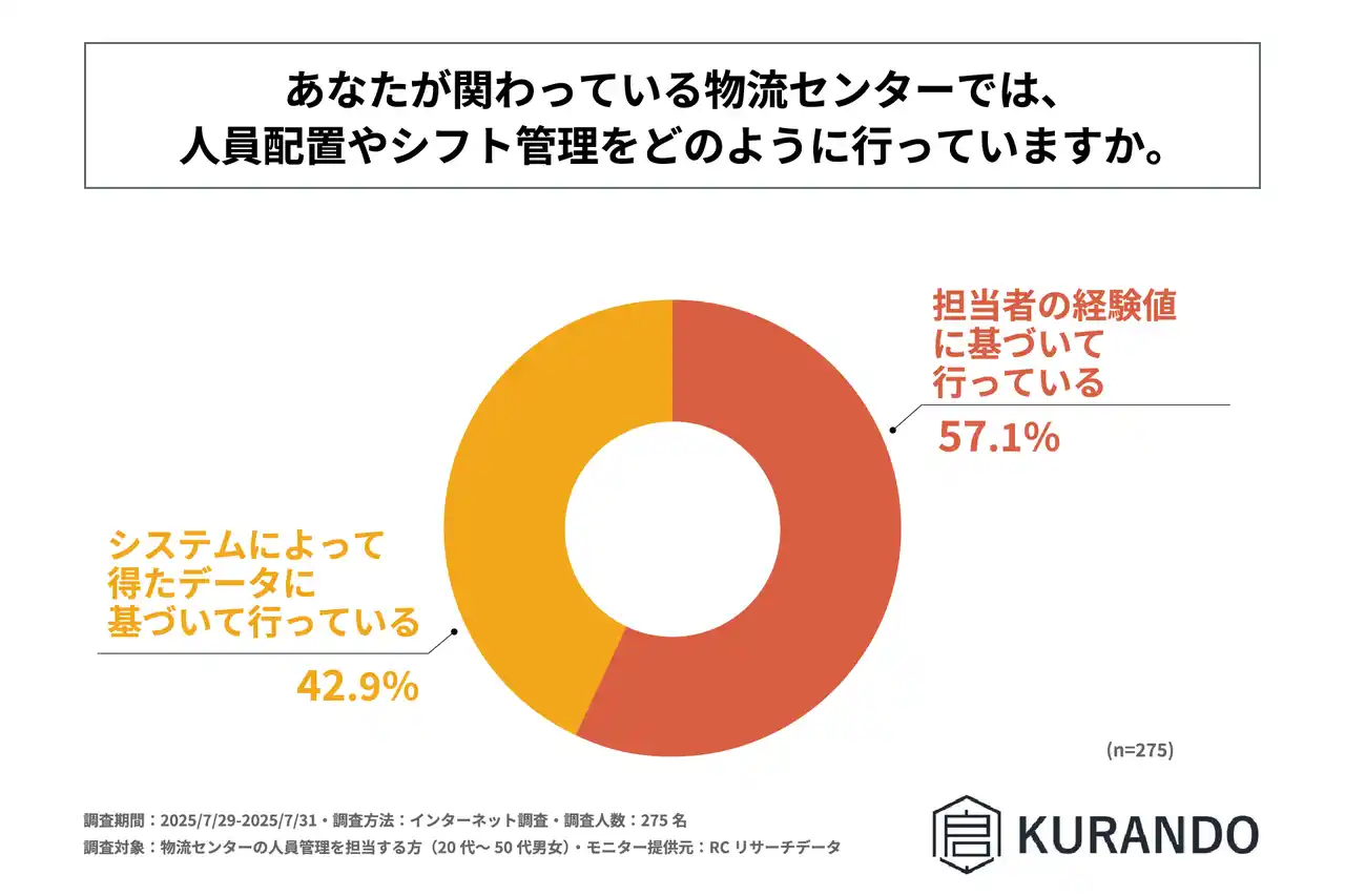 働き方改革関連法の適用による「2024年問題」。トラックドライバーの労働時間への影響が大きく報じられる一方で、その余波は物流の結節点である物流センターの運営にも及んでおり、限られた人的リソースでいかに現場を回していくかが、喫緊の課題となっています。さらに、EC市場の拡大などを背景に、現場の業務量は増加の一途をたどっています。このような状況下で、現場の生産性を大きく左右するのが、日々の人員配置やシフト管理です。しかし、その重要な管理業務が、未だに個人の経験や勘に頼った属人的な手法で行われている現場も少なくありません。そこで、株式会社KURANDOは、物流センターで人員管理を担当する方を対象に、「物流センターの人員管理」に関する調査を実施しました。 |