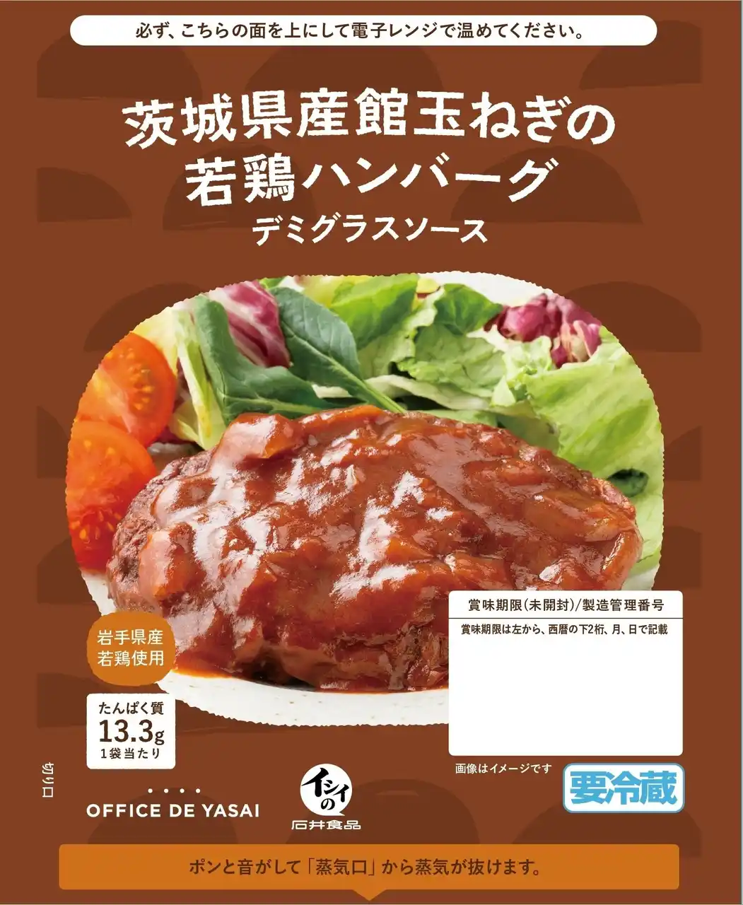 食の福利厚生サービス“設置型健康社食(R)“「OFFICE DE YASAI(オフィスで野菜)」を展開する株式会社KOMPEITO(東京都品川区、代表取締役CEO 渡邉瞬)は、食の安心・安全にこだわる食品メーカー・石井食品株式会社(本社:千葉県船橋市、代表取締役社長:石井智康、以下「石井食品」)と共同開発した新商品「館玉ねぎの若鶏ハンバーグ」を、2025年8月より冷蔵プランにて提供開始します。 |