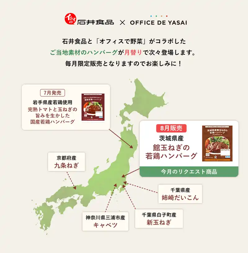 全国各地の“旬”の野菜を主役にし、国産若鶏を使用したハンバーグと一緒に味わうことができるシリーズです。月替わりで各地の野菜や食材にスポットを当て、オフィスにいながら“地域の旬”や“食の背景”に触れられる新しい食体験を提案します。 |