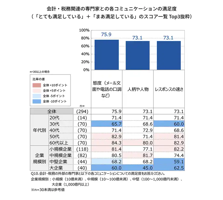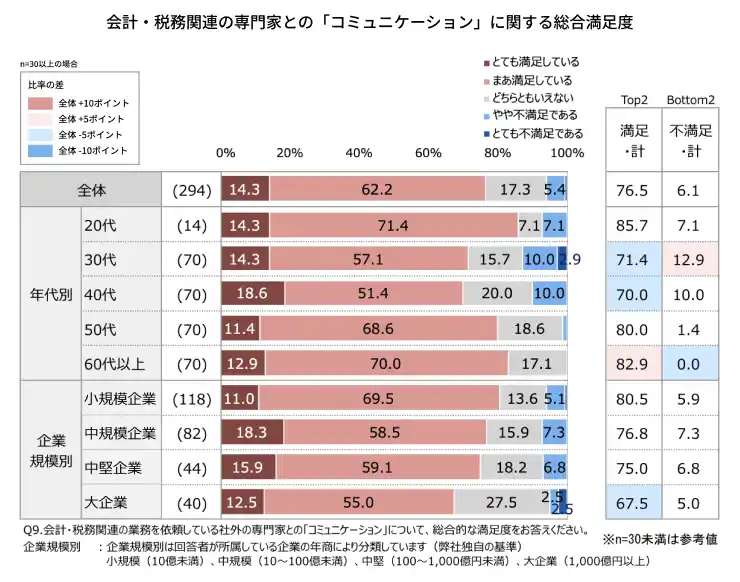 調査の結果、全体の約8割が専門家とのコミュニケーションに満足していることが明らかになりました。ただ、一方で、年代や企業規模によって満足度に差があるなど、今後改善すべき課題も浮き彫りとなっています。AGSでは、本調査の結果を踏まえ、より質の高い専門サービスの提供に向け、邁進してまいります。 |