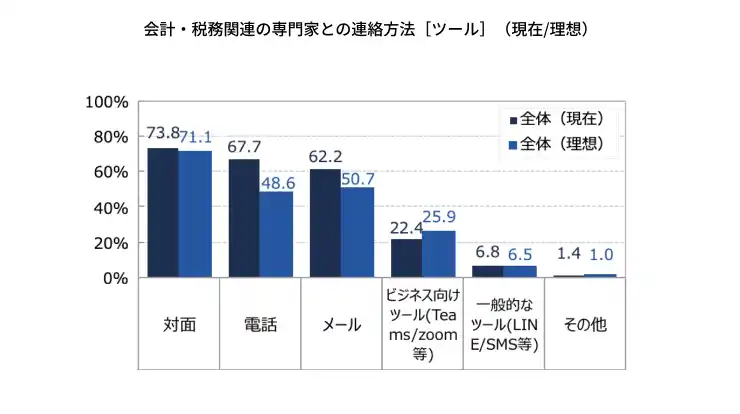 「電話」の利用意向は大きく減少する一方、「ビジネス向けツール(Teams、Zoom等)」への期待が高まっている様子が窺えます。 |