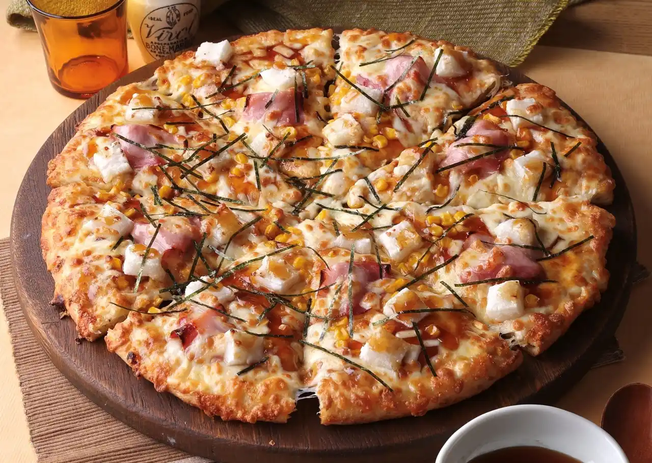 テリヤキソースの甘じょっぱい味をベースに、お餅をたっぷりトッピングした和風ピザ。生ハムの塩味とコーンの甘味がアクセント。 |