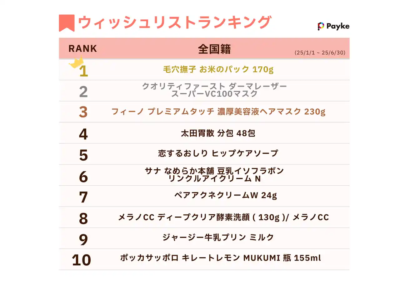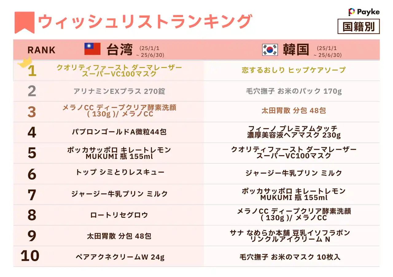 | 株式会社Payke(本社:沖縄県那覇市、代表取締役:古田 奎輔、以下Payke)は、提供する訪日外国人向けショッピングサポートアプリ「Payke(ペイク)」において、2025年1月1日~6月30日に取得されたデータをもとに、「ウィッシュリスト登録」商品ランキングを集計しました。今回は、全体(全国籍)と国籍別(台湾・韓国)のTOP10を発表します。 | |||||||||