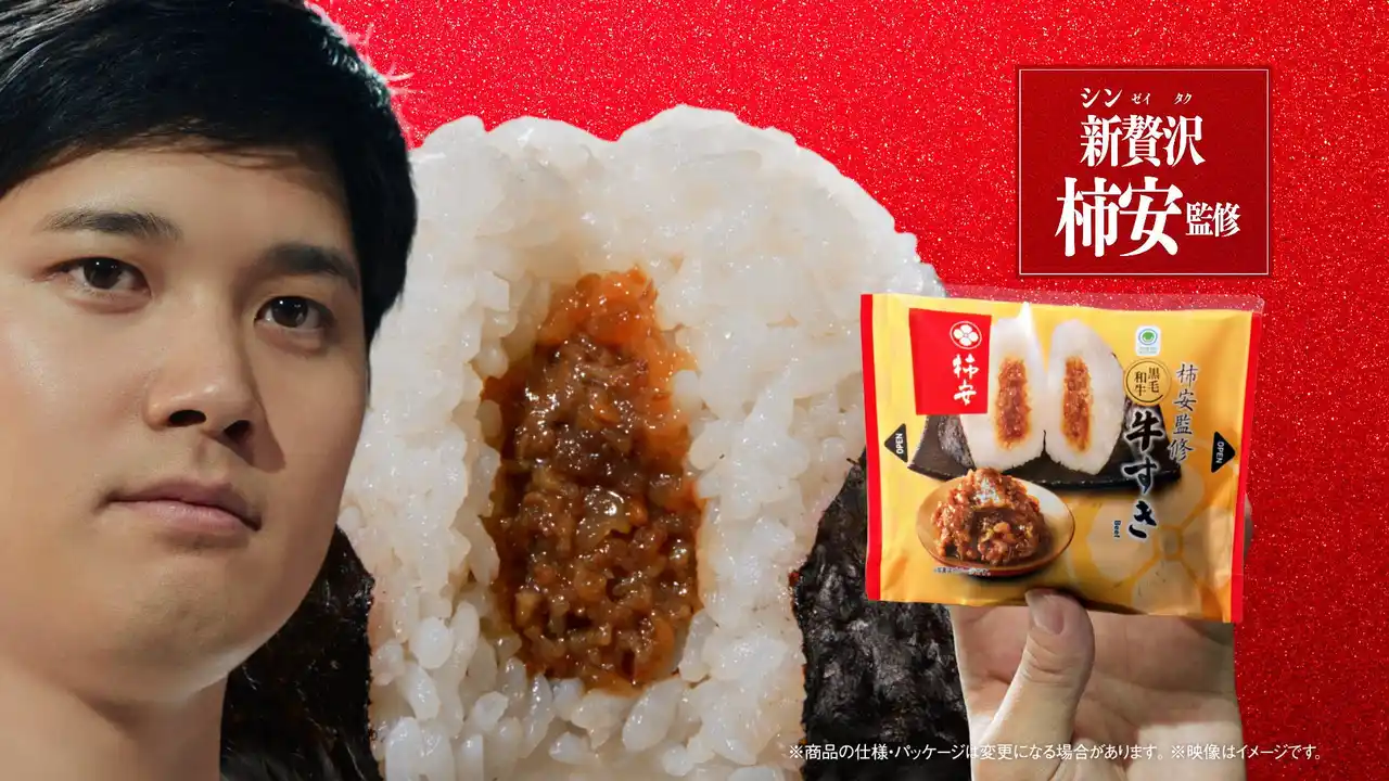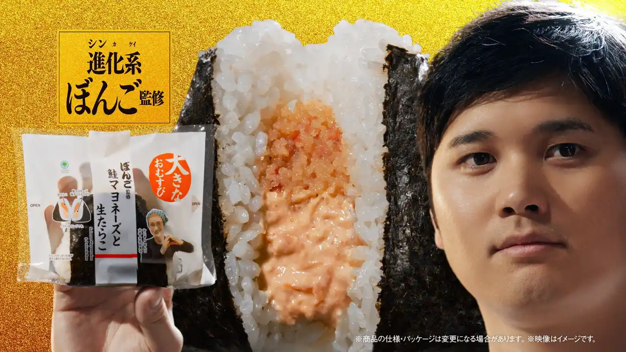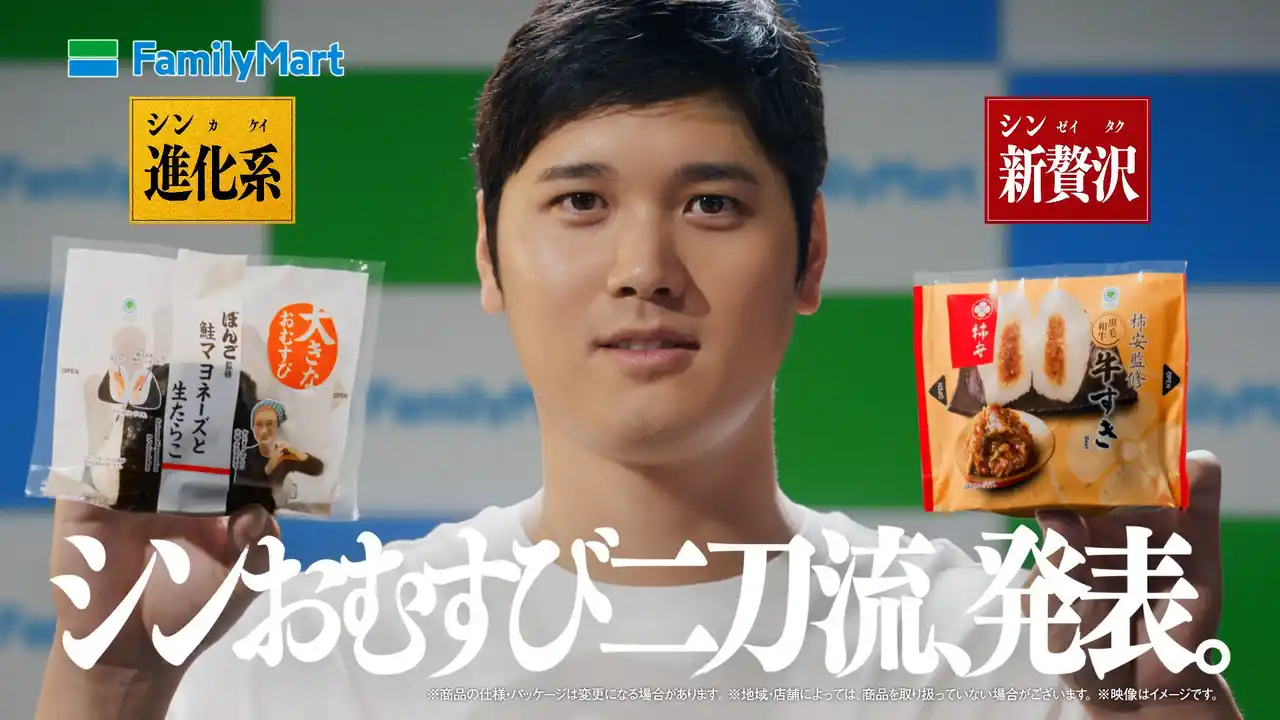 また、今年2月に当社の“おむすびアンバサダー”に就任した大谷翔平選手を起用した新キービジュアルおよび、今回発売する”シン”おむすびを両手に持ち、「シンおむすび、二刀流」を発表する記者会見風の新CMを放映いたします。この機会に、名店の味わいを気軽に楽しめる“シンおむすび”と、大谷選手の新ビジュアルにもご注目ください。 |