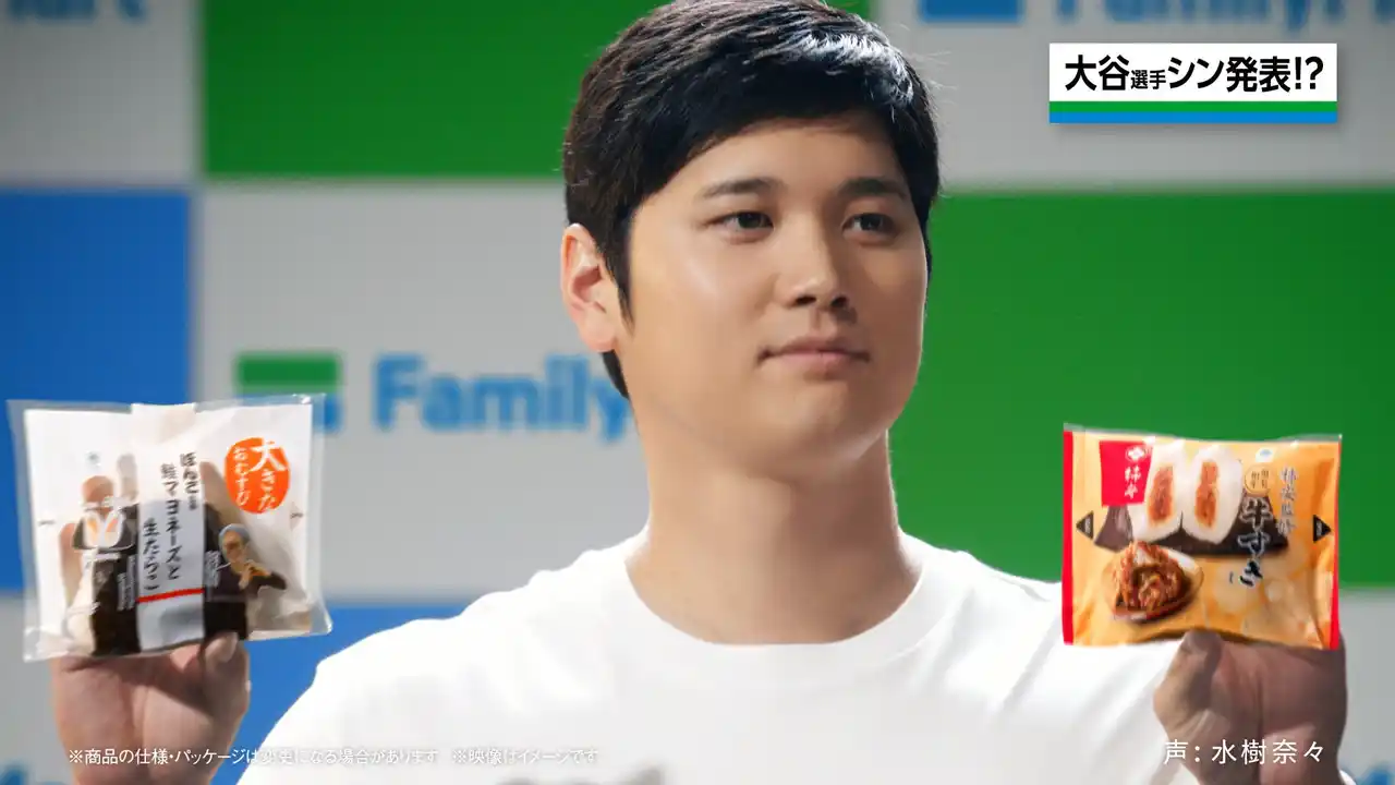 前回に続き、記者会見風のスタイルで展開される今回の新CM。“進化系(シンカケイ)”と“新贅沢(シンゼイタク)”という2つの「シン」おむすびを、大谷選手自らが発表する構成です。 |