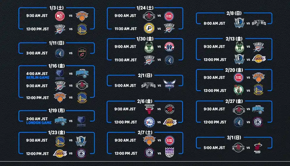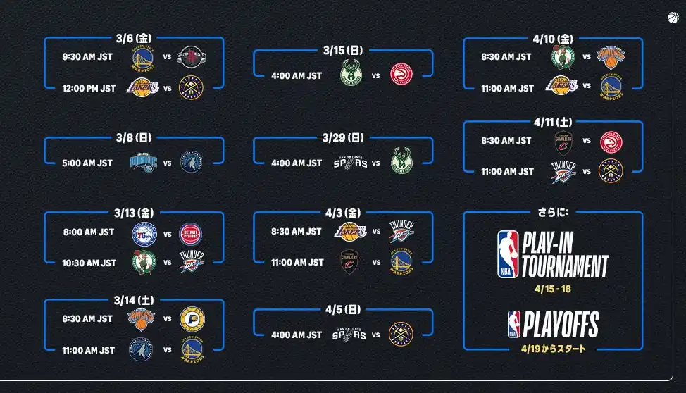 12月6日(土)には、セルティックスがレイカーズをホームに迎え、NBAを代表するライバル同士が対決します。1月24日(土)には、昨シーズンのNBAファイナルの再戦となるインディアナ・ペイサーズ対オクラホマシティ・サンダーの試合を配信します。さらに、2月6日(金)には河村選手が所属するシカゴ・ブルズとトロント・ラプターズの試合を、4月10日(金)にはレブロン・ジェームス率いるロサンゼルス・レイカーズとステフィン・カリー要するゴールデンステイト・ウォーリアーズによるライバル対決も配信します。 |