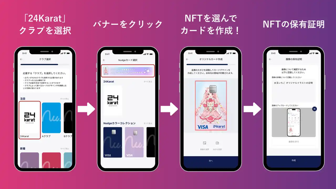 ナッジカードの「24karat」クラブに入会すると、24karatが公式に発行・許諾したVTuberのNFTを使って、世界に1枚だけのオリジナルクレジットカードを作成できます。 |