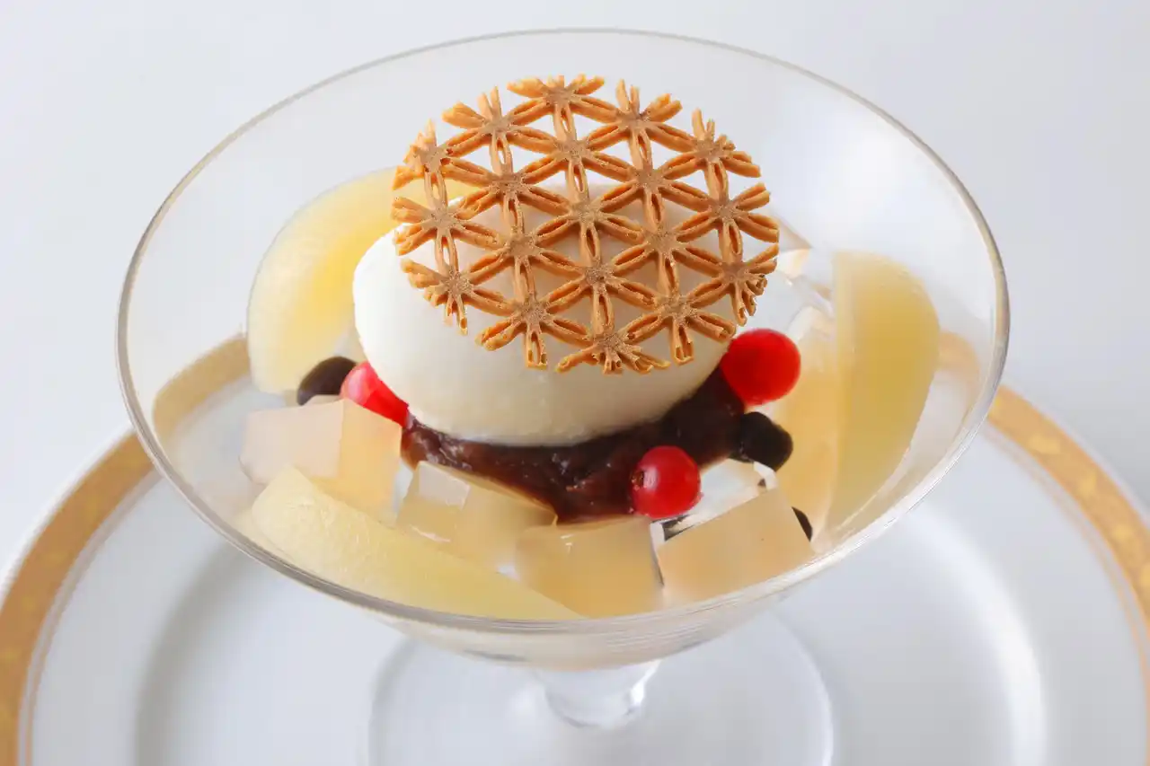 【蝶花楼桃花】の一皿 ~こよなく愛する桃の甘美~桃のコンポートあんみつとミルクジェラート |