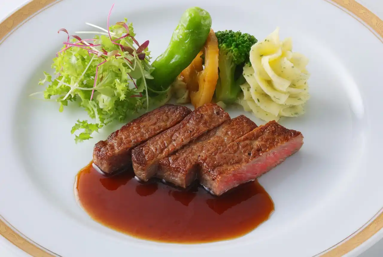 【桂文珍】の一皿 ~上方落語と日本が誇る和牛の出自~黒毛和牛ロースのステーキ すき焼き風グレイビーソース |