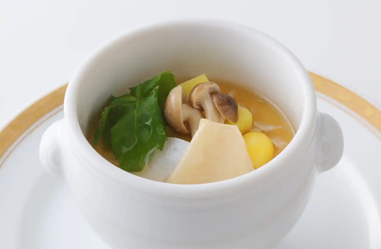 立川晴の輔 × 洋風茶碗蒸し すじ雲の銀餡仕立て あたたかく洒脱な語りで親しまれる「立川晴の輔」の一皿は、秋の収穫を詰め込んだ洋風茶碗蒸し。やさしい野菜コンソメに絹のように揺らめく湯葉を浮かべた銀餡が素材の味を引き立てる、心までほぐれるような味わいが魅力です。 |