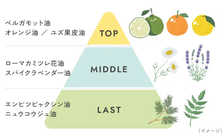 一滴を肌にのせた瞬間、まるで果実のエネルギーが溶け込むように広がります。乾いた肌と心にじんわりとビタミンがチャージされ、澄んだ透明感が内側からめぐり始めるような香りです。 |