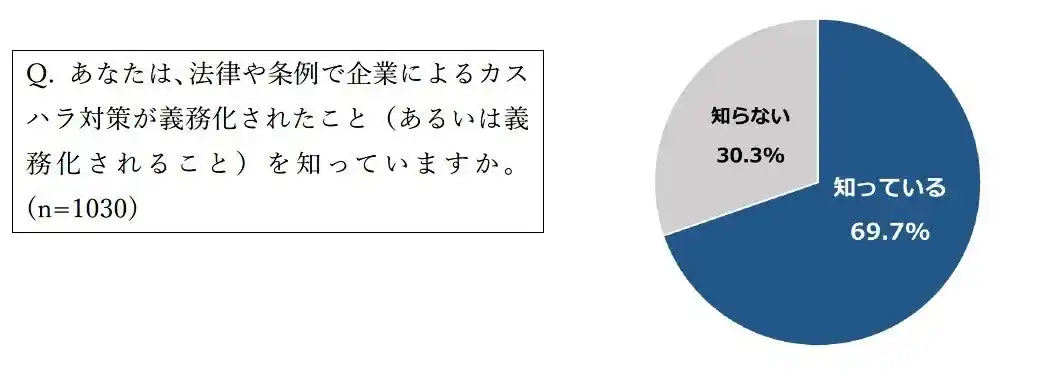 2026年施行予定の労働施策総合推進法のほか、2025年の東京都のカスハラ防止条例施行をはじめ、各都道府県でもカスハラ対策の義務化が進む。今回の調査において、法律や条例によるカスハラ対策義務化の認知度を調査したところ、約7割(69.7%)が知っているとの回答であったが、約3割(30.3%)が知らないとの回答であった。 |