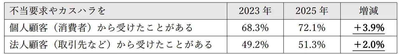 前回調査と比較すると、消費者から・取引先からのいずれにおいても、不当要求やカスハラを受けたことがあるとの回答が微増していた。 |