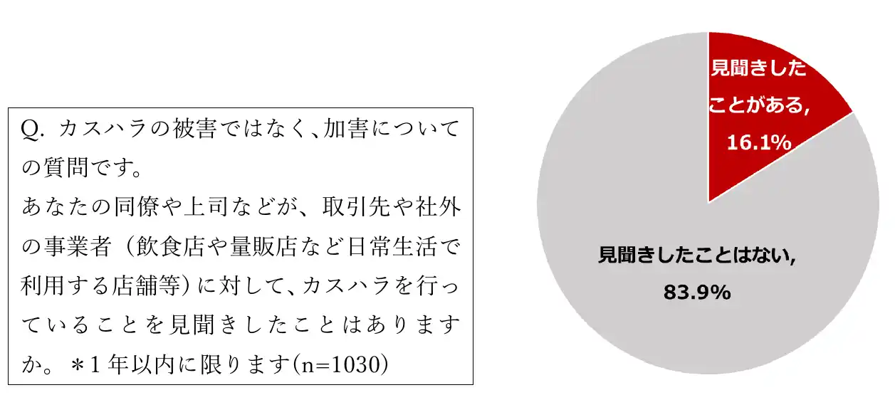 2026年施行予定の労働施策総合推進法において、事業者は、社員がカスハラの加害者にならないよう、労働者の言動に必要な注意をはらい、研修等の必要な配慮をするよう努めなければならないとされている。こうした中、今回の調査においてカスハラ加害者を見聞きしたことがあるかどうかを調査したところ、16.1%が見聞きしたことがあるとの回答であった。今後は社員が、カスハラ加害者にならないための取り組みも企業として必須である。 |
