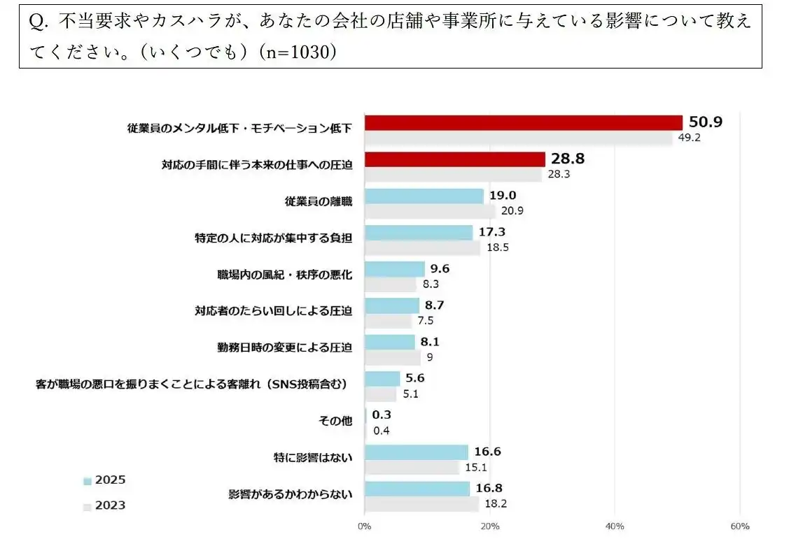 不当要求やカスハラが与える影響については、前回調査と同様「従業員のメンタル低下・モチベーション低下」が最も多く(50.9%)、次いで「対応の手間に伴う本来の仕事への圧迫」であった(28.8%)。 |
