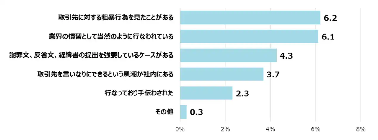 同僚や上司のカスハラ加害を見聞きしたことがある回答者は、見聞きした内容について「取引先に対する粗暴行為を見たことがある」(6.2%)、「業界の慣習として当然のように行われている」(6.1%)を選択した。 |