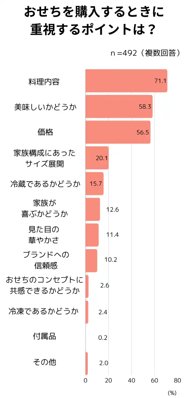 ・おせち購入時に重要視するのは、1位「料理内容」、2位「美味しいかどうか」、3位「価格」 ※複数回答、回答数の多い順 |