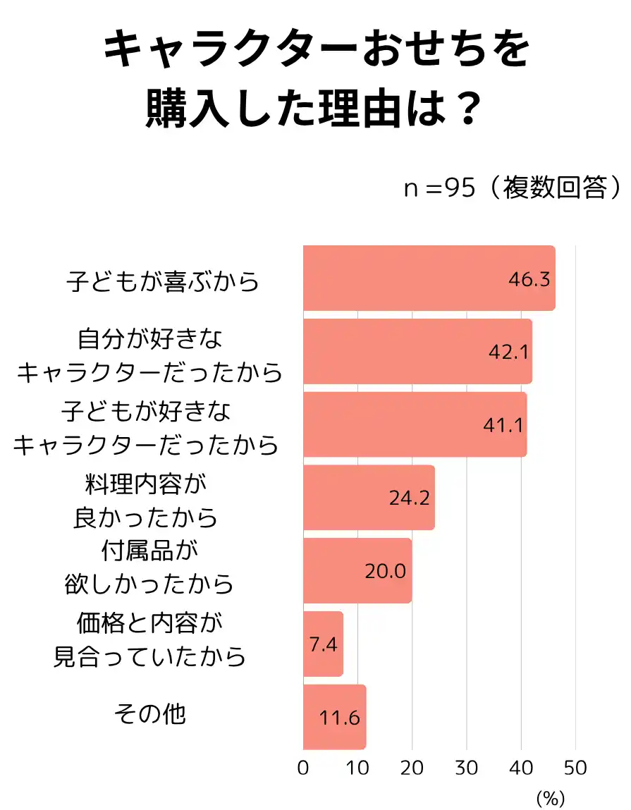 購入理由は1位「子どもが喜ぶ」、2位「自分が好きなキャラクター」、3位「子どもが好きなキャラクター」 ※複数回答、回答数の多い順 |