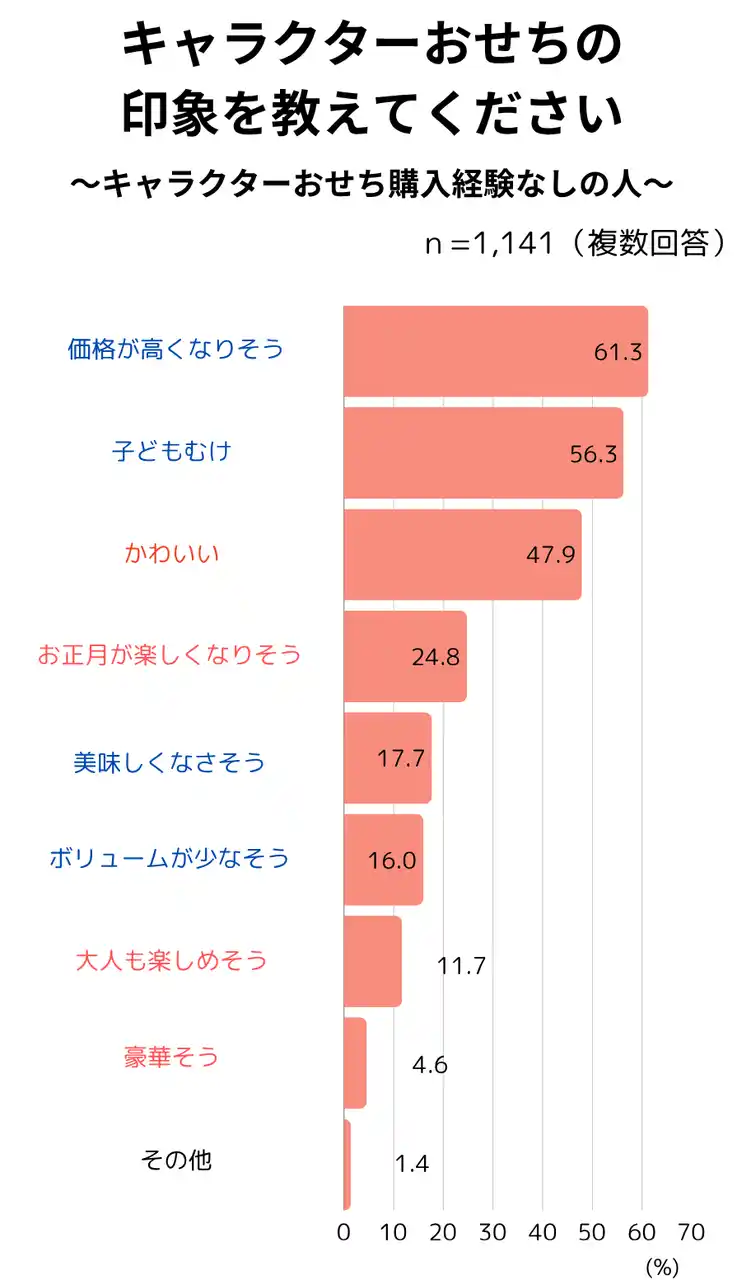 また、キャラクターおせちを購入した人は7.7%となりました。未購入者のイメージとしては、「値段が高くなりそう」、「子ども向け」、「かわいい」という声が多く挙がりましたが、実際の購入者からは「子どもが喜ぶから」、「子どもが好きなキャラクターだから」に加え、「自分が好きなキャラクターだから」という意見も上がり、実際には大人もキャラクターおせちを楽しんでいる実態が明らかになりました。 |