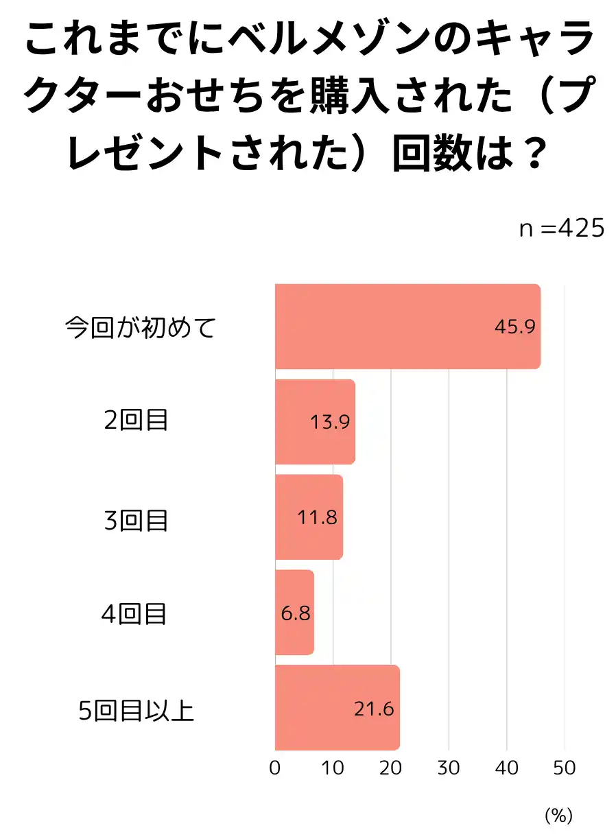 アンケート回答者のうち、2回以上購入いただいたお客様が約54.1%とリピート率も高く(5回以上購入は約21.6%)、顧客満足度約86.6%と高い評価を得ています。キャラクターおせちでお正月を楽しみたいというお客様のニーズに応え、今後も品質と満足度の向上に努めてまいります。 |