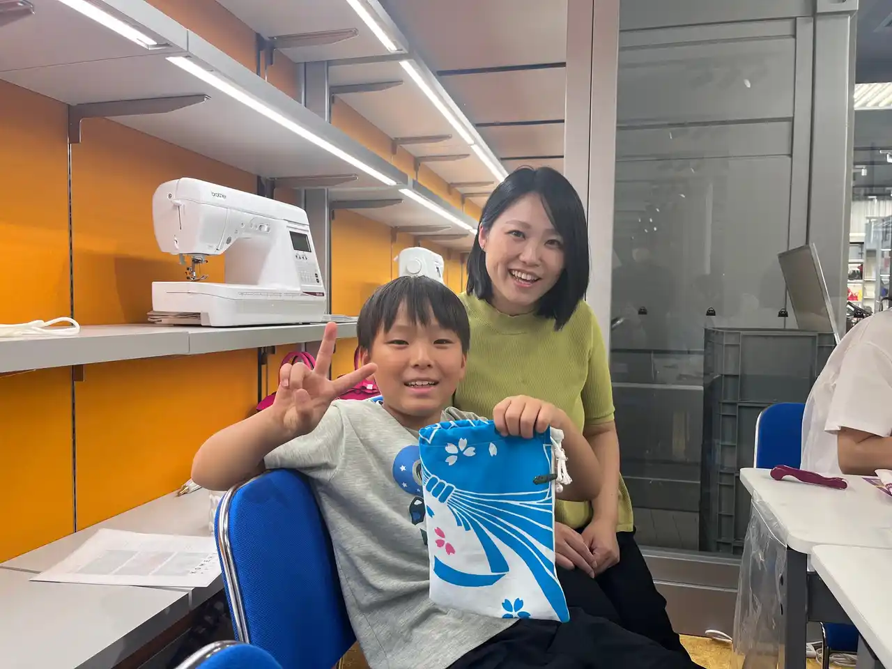| 初めてミシンに触れる参加者も多く、真剣な表情で講師のアドバイスを受けながらオリジナルの巾着を完成させました。 | |||||||||