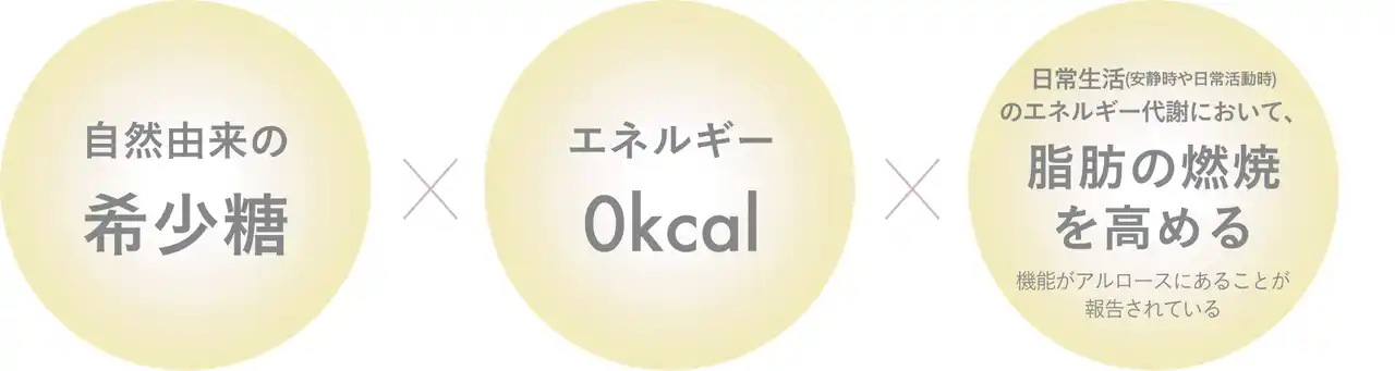 自然界にわずかしか存在しない約50種類の希少糖のひとつで、乾燥いちじくやレーズンにわずかに含まれています。本品は香川大学と松谷化学工業株式会社が共同で開発した希少糖アルロース(商品名:アストレア(R)︎)を使用しています。日常生活(安静時や日常活動時)のエネルギー代謝において、脂肪の燃焼を高める機能があることが報告されています。 |