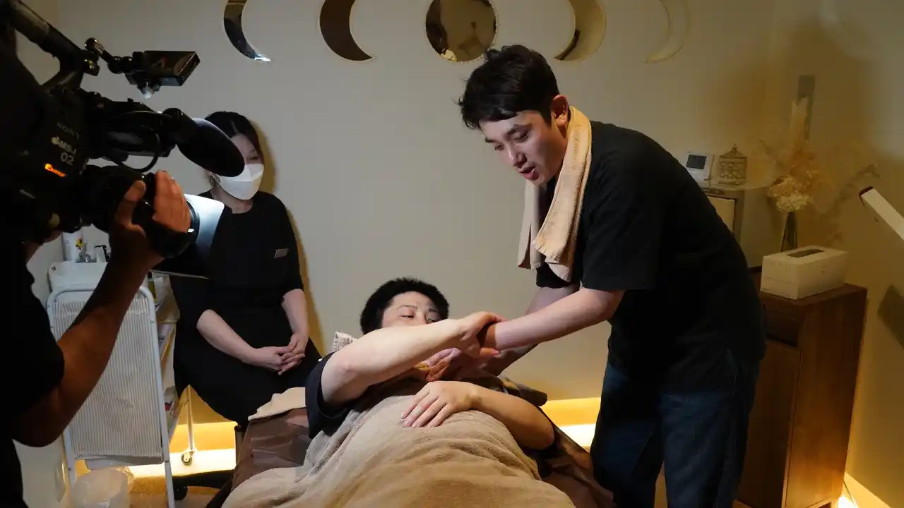 パールフェイシャルの施術中、“デニムエステティシャン”を名乗る前田さんが登場。 |