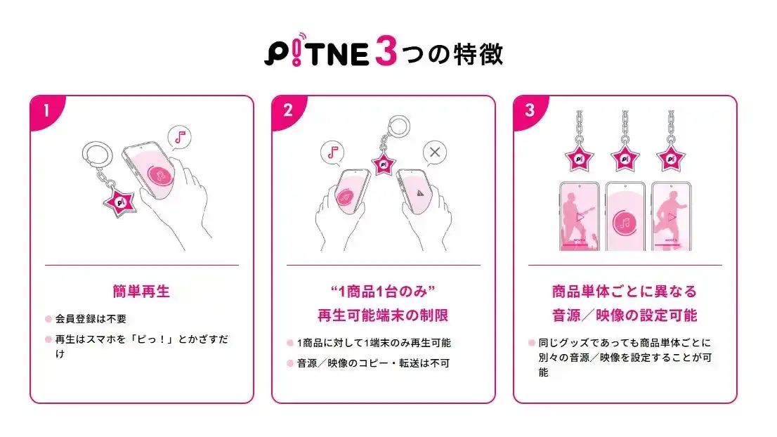 「P!TNE」は、NFC(Near Field Communication:近距離無線通信)技術を活用し、グッズとデジタルコンテンツ(音、楽曲、ボイス、映像など)を組み合わせることを可能とした、新しいエンタメ体験をお届けするファングッズソリューションです。NFCタグを設定したグッズにスマホをかざすことで、「P!TNE」アプリから設定したコンテンツが流れる仕組みとなっています。 |