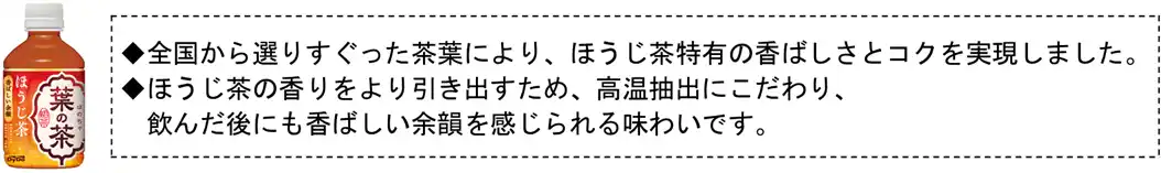 | 「葉の茶 ほうじ茶 280ml」は、全国から選りすぐった茶葉により、ほうじ茶特有の香ばしさとコクを実現しました。ほうじ茶の香りをより引き出すため、高温抽出にこだわり、飲んだ後にも香ばしい余韻を感じられる味わいに仕立てました。 | |||