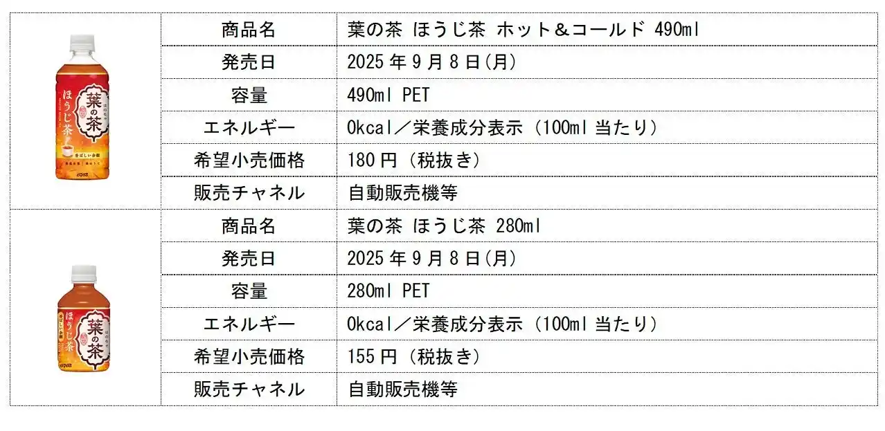 | ダイドードリンコ株式会社(本社:大阪市北区、代表取締役社長:中島 孝徳)は、2025年秋冬の新商品として、「葉の茶 ほうじ茶 ホット&コールド 490ml」「葉の茶 ほうじ茶 280ml」を9月8日(月)より発売いたします。 | |||