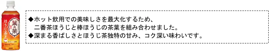 | 「葉の茶 ほうじ茶 ホット&コールド 490ml」は、二番茶ほうじと棒ほうじを合わせたこだわりのブレンドで、茶葉を直火でじっくり焙煎したコク深い味わいです。 | |||