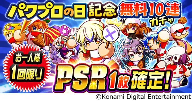 期間中、「パワプロの日記念無料10連ガチャ」を回すと「PSR」のイベキャラ1枚が確定で出現! |