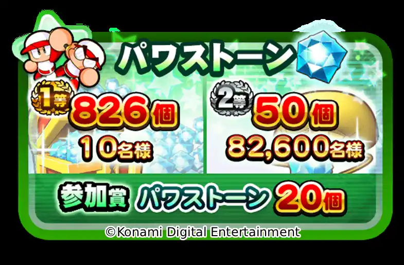 抽選で10名様にパワストーン826個、82,600名様にパワストーン50個をプレゼント!当たらなかった場合でも、参加賞としてパワストーン20個がもらえます。 |