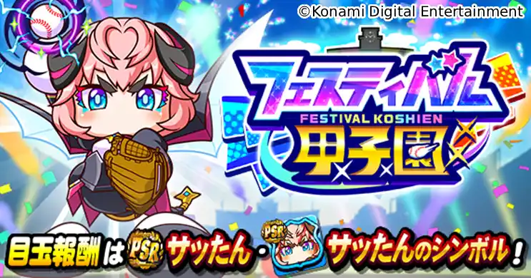 「フェスモード」と「腕試しモード」の2つのモードをプレーできる新イベント「フェスティバル甲子園」を開催!何度も試合をして、豪華報酬を獲得しましょう。目玉報酬は「PSRサッたん」&「PSRサッたんのシンボル」です。 |