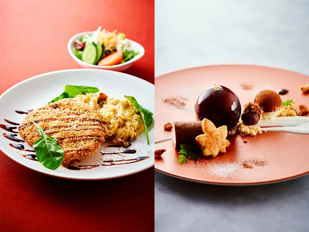 | カツレツに豊潤な香りのポルチーニのリゾットを盛り合わせたボリューミーなセットメニュー「ビーフカツレツ レックコート風&ポルチーニのリゾット」のほか、食感や仕立ての異なる3種のティラミスを一皿に盛り合わせた「ティラミス×ティラミスプレート」をご用意。 | |||||