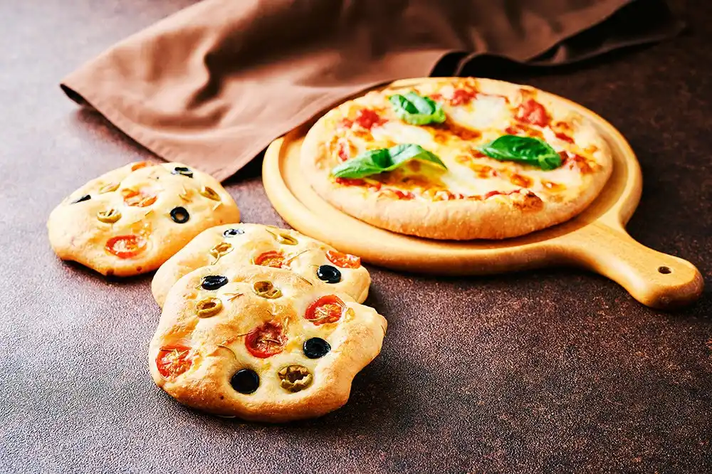 | ホテルメイドのピザとフォカッチャで気軽にイタリア気分をお楽しみください。イートインのお席もご用意しております。 | |||||