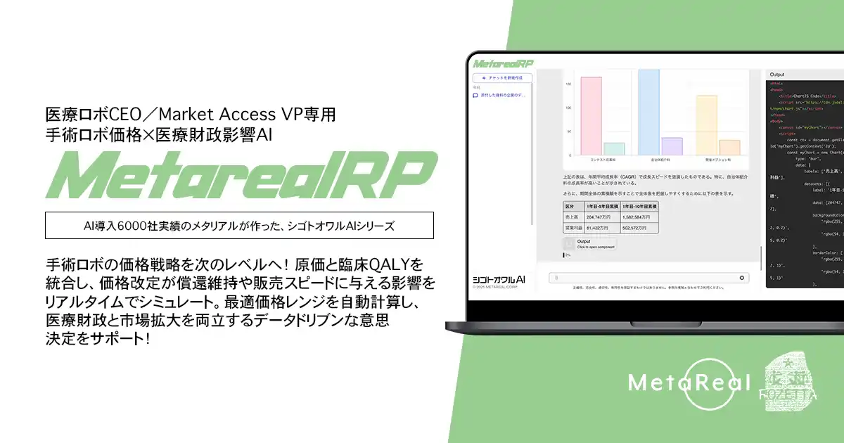 Metareal RPは、手術ロボットの価格戦略と医療財政インパクトを同時にシミュレーションできるAIエージェントです。原価データと臨床QALY(質調整生存年)を統合し、価格改定が償還維持と販売台数成長スピードに及ぼす影響を瞬時に算出します。 |