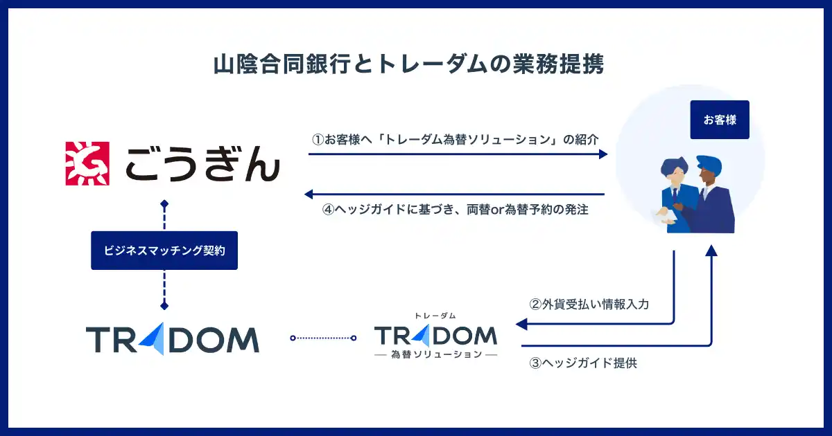 トレーダム株式会社(本社:東京都千代田区、代表取締役社長:浦島 伸一郎、代表取締役:阪根 信一、以下「当社」)は、山陰合同銀行(本社:島根県松江市、頭取:吉川 浩、以下「ごうぎん」)と高度な企業の為替リスク管理の推進を目指し、「ごうぎん」のお客様である事業法人に対してAI為替リスク管理システム『トレーダム為替ソリューション』の紹介するビジネスマッチング契約を締結したことをお知らせいたします。 |