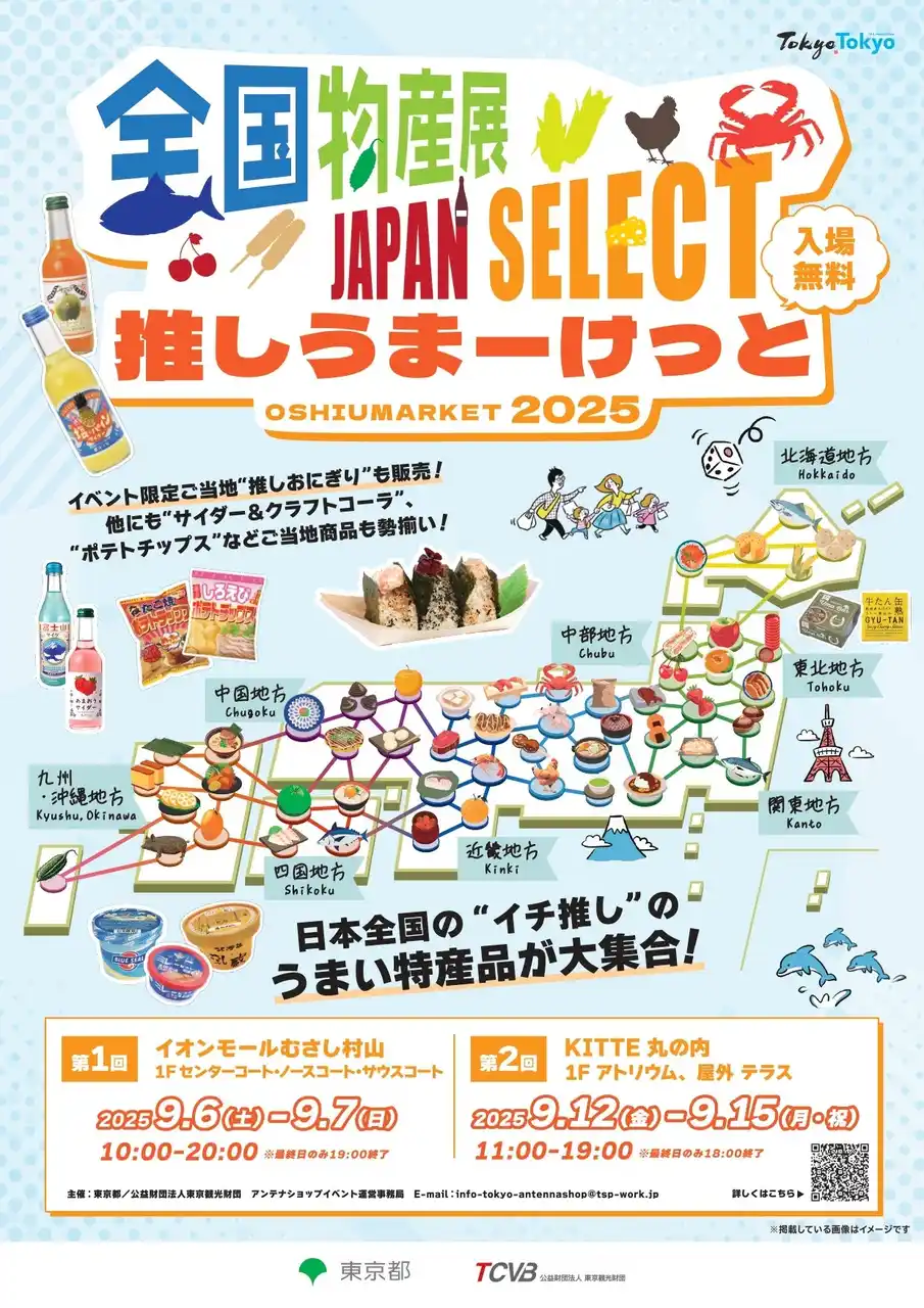 東京都及び公益財団法人 東京観光財団が主催し、第1回は2025年9月6日(土)~7日(日)の2日間、イオンモールむさし村山、第2回は、9月12日(金)~15日(月・祝)の4日間、KITTE丸の内にて開催いたします。本イベントは、全国のアンテナショップ等と連携し、日本全国の“イチ推し”の美味しい特産品を集め、食を通じて47都道府県の魅力を感じていただき、来場者皆様の“推し”を見つけていただくイベントです。 |