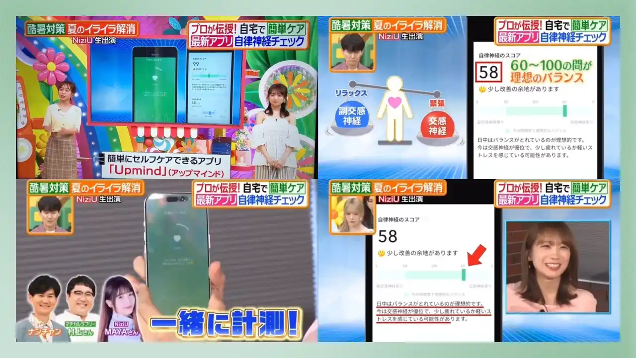 日本テレビ系「ヒルナンデス」で夏のイライラを解消する簡単セルフケアの方法として、Upmindをご紹介頂きました。今後も、より多くの方が身近に取り入れやすいヘルスケアの手段として浸透できるようサービス改善に取り組んでまいります。 |
