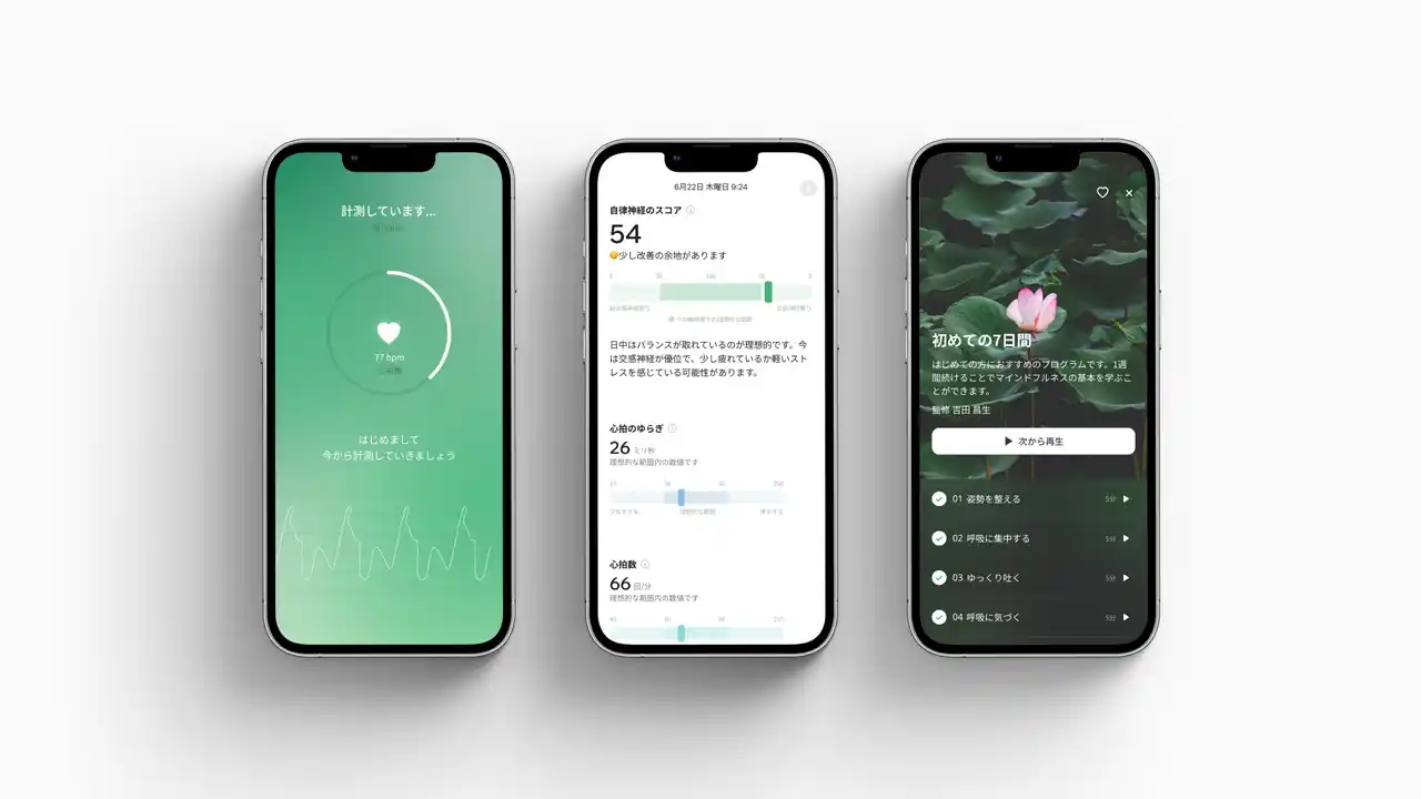 落ち着きのあるUI/ UX・手短な瞑想やヨガのプログラムが好評で、累計ダウンロード数は150万を超え、グッドデザイン賞を受賞、国内最大のマインドフルネスアプリのサービスとなっております。 スマホのカメラからユーザーの心拍のデータを取得、心拍変動解析の技術を利用し、自律神経の状態を見える化。また、専門家監修の瞑想やヨガなどで手軽にマインドフルネスも実践でき、客観的かつ効果的に自律神経や心を整えることができるアプリとなります。 |